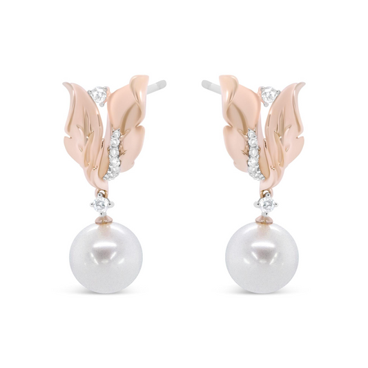 14K Rose Gold 1/6 Cttw Round Diamond and 8mm Round Pearl Floral Drop Stud Earrings (H-I Color, I1-I2 Clarity)