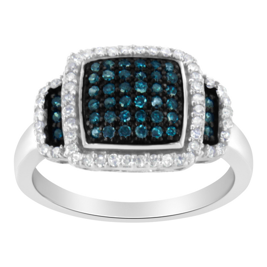Black Rhodium Plated .925 Sterling Silver 1/2 Cttw White & Blue Diamond Square Halo Cocktail Ring (Fancy Blue & H-I Color, I2-I3 Clarity)