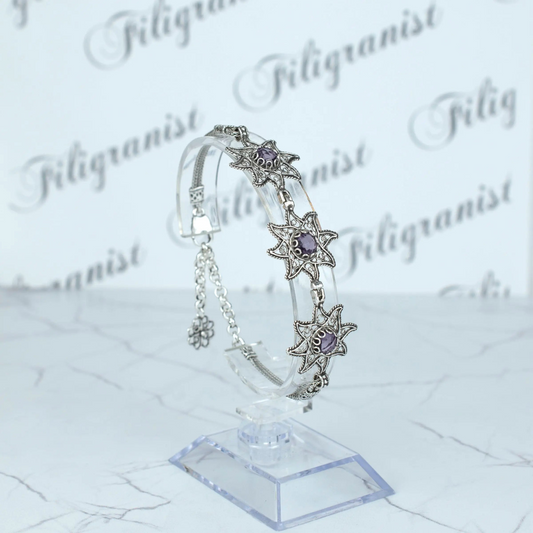 Filigree Art Amethyst Gemstone Star Figured Women Silver Link Bracelet