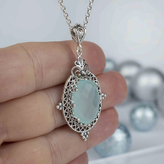 Filigree Art Aqua Chalcedony Gemstone Women Silver Oval Pendant Necklace