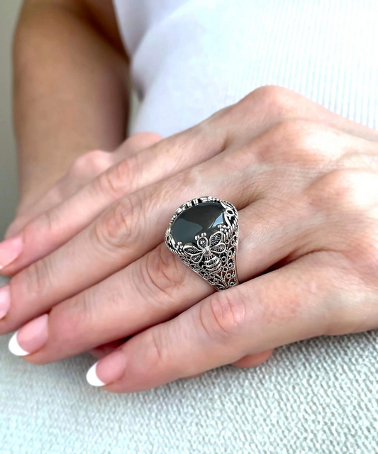 Filigree Art Bee Detailed Gray Moonstone Gemstone Women Silver Statement Ring