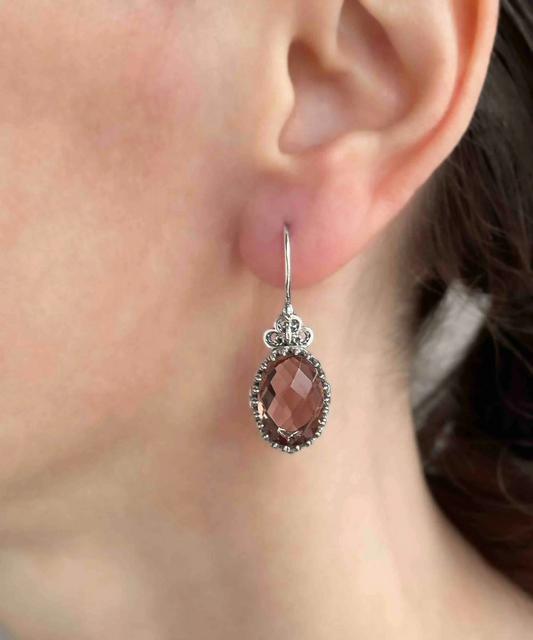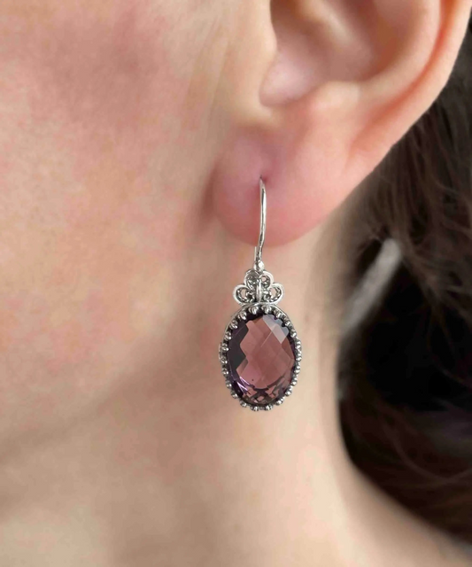 Filigree Art Amethyst Gemstone Heart Detailed Women Silver Oval Drop Earrings