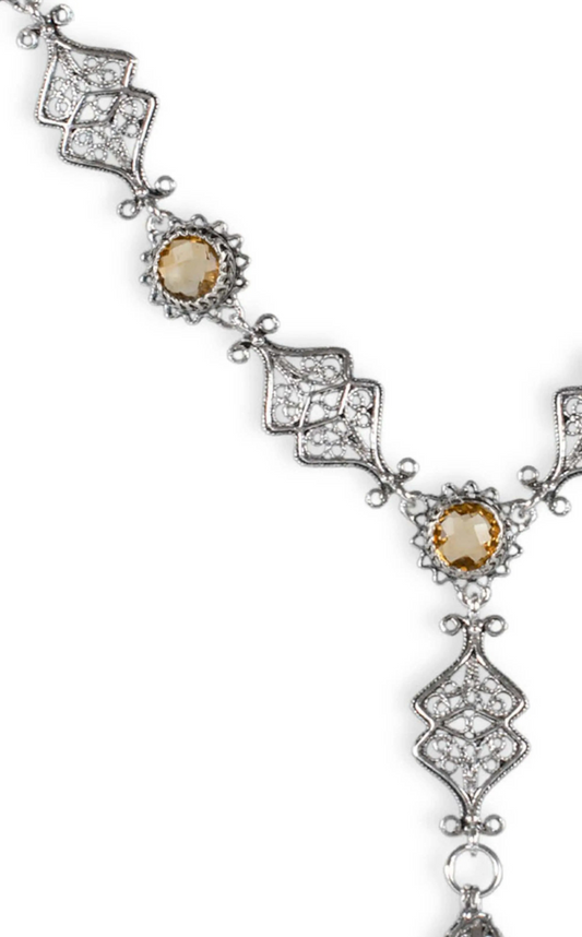 Filigree Art Black Onyx / Citrine / Prasiolite Gemstone Women Silver Tassel Choker Necklace