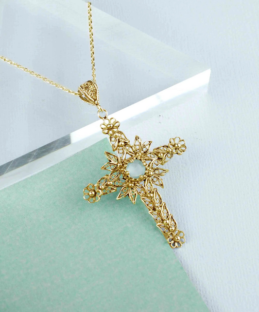 Filigree Art Aqua Chalcedony Gemstone Women Gold Plated Silver Cross Pendant Necklace