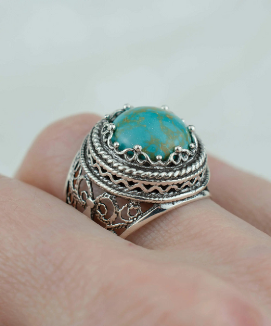 Filigree Art Copper Turquoise Gemstone Women Silver Bold Ring