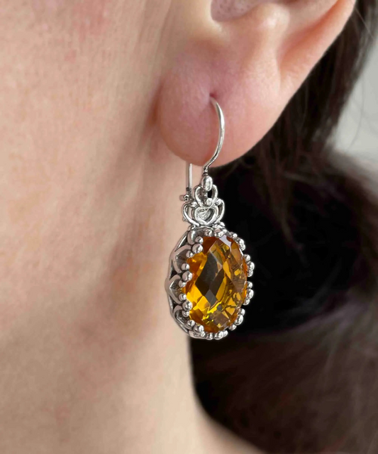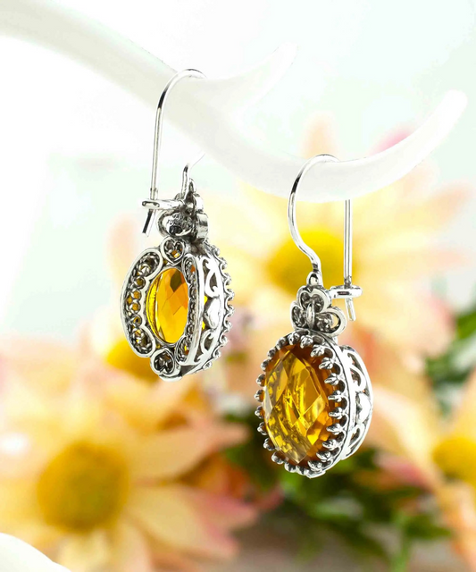 Filigree Art Citrine Gemstone Crown Figured Women Silver Oval Drop Earrings