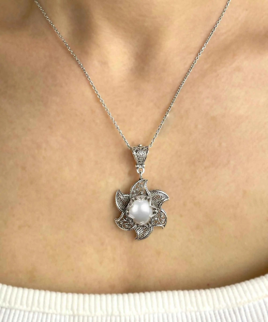Filigree Art Freshwater Pearl Blossoming Lotus Flower Women Silver Pendant Necklace