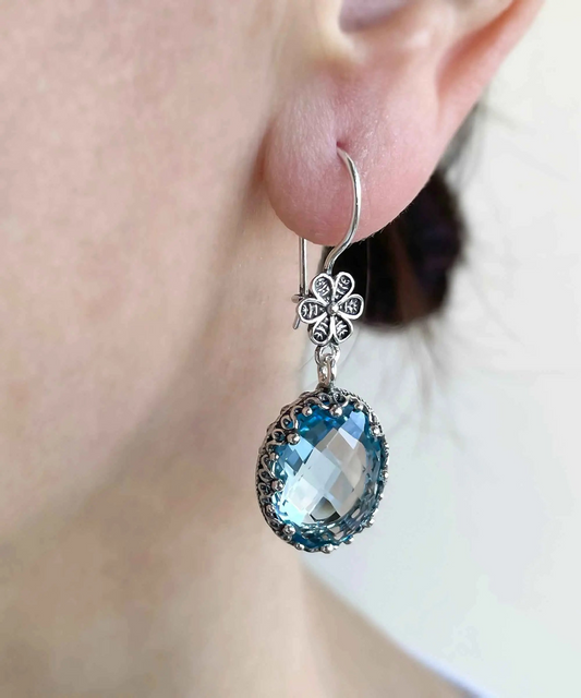 Filigree Art Blue Topaz Gemstone Women Silver Oval Dangle Earrings