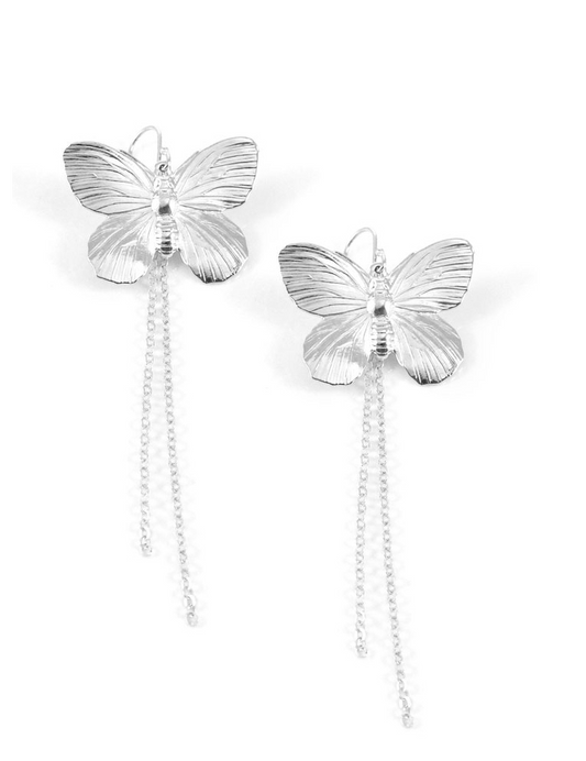 Long-length rhodium plated butterfly earrings