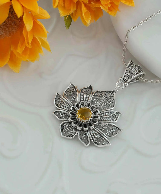 Filigree Art Silver Lotus Flower Citrine Gemstone Women Pendant Necklace