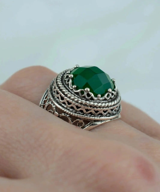 Filigree Art Green Agate Gemstone Women Silver Bold Ring