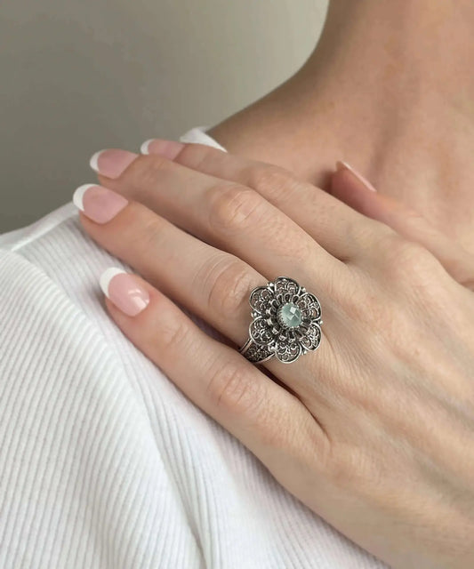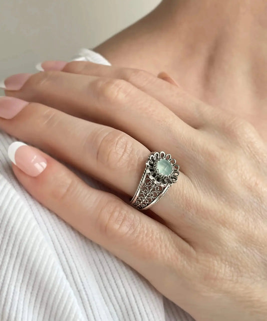 Filigree Art Aqua Chalcedony Gemstone Women Silver Statement Ring