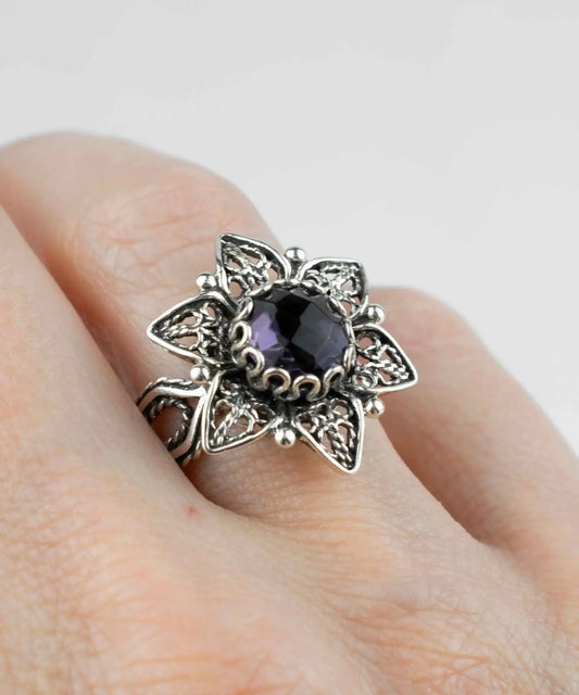 Filigree Art Amethyst Gemstone Daisy Flower Women Silver Cocktail Ring