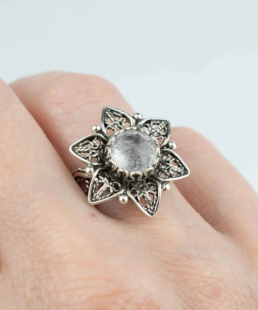 Filigree Art Black Rutile Gemstone Daisy Flower Women Silver Cocktail Ring