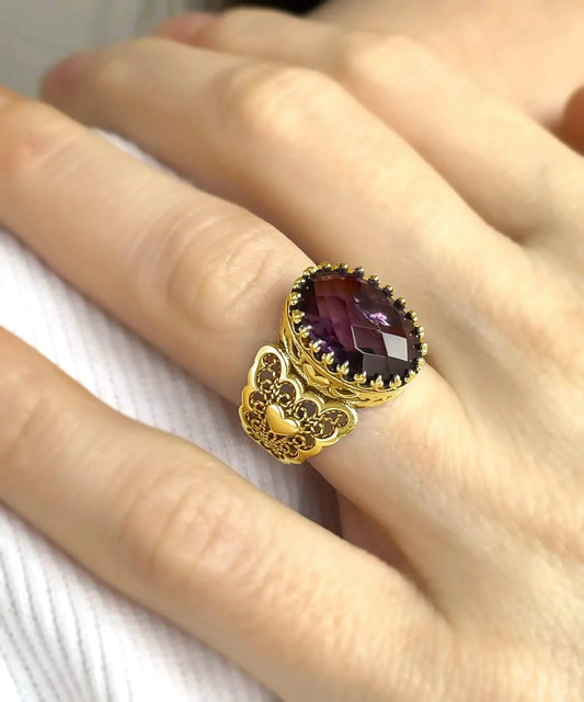 Double Heart Detailed Amethyst Gemstone Filigree Art Gold Plated Sterling Silver Women Statement Ring