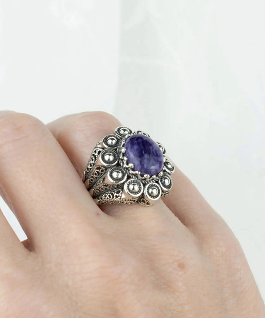 Filigree Art Charoite Gemstone Women Statement Dome Ring