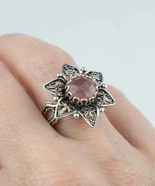 Filigree Art Cherry Quartz Gemstone Daisy Flower Women Silver Cocktail Ring