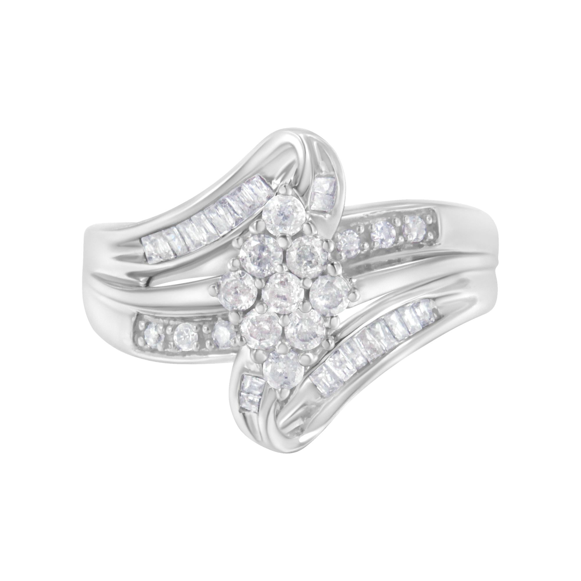 Crafted in lustrous 10k white gold, this bypass ring showcases a dazzling round diamond cluster. Soft ribbons split from the ring band and surround the cluster. Round and baguette cut diamonds inlay the ribbons. A 1/2ct TDW of diamonds give this ring an unique and eye catching design.