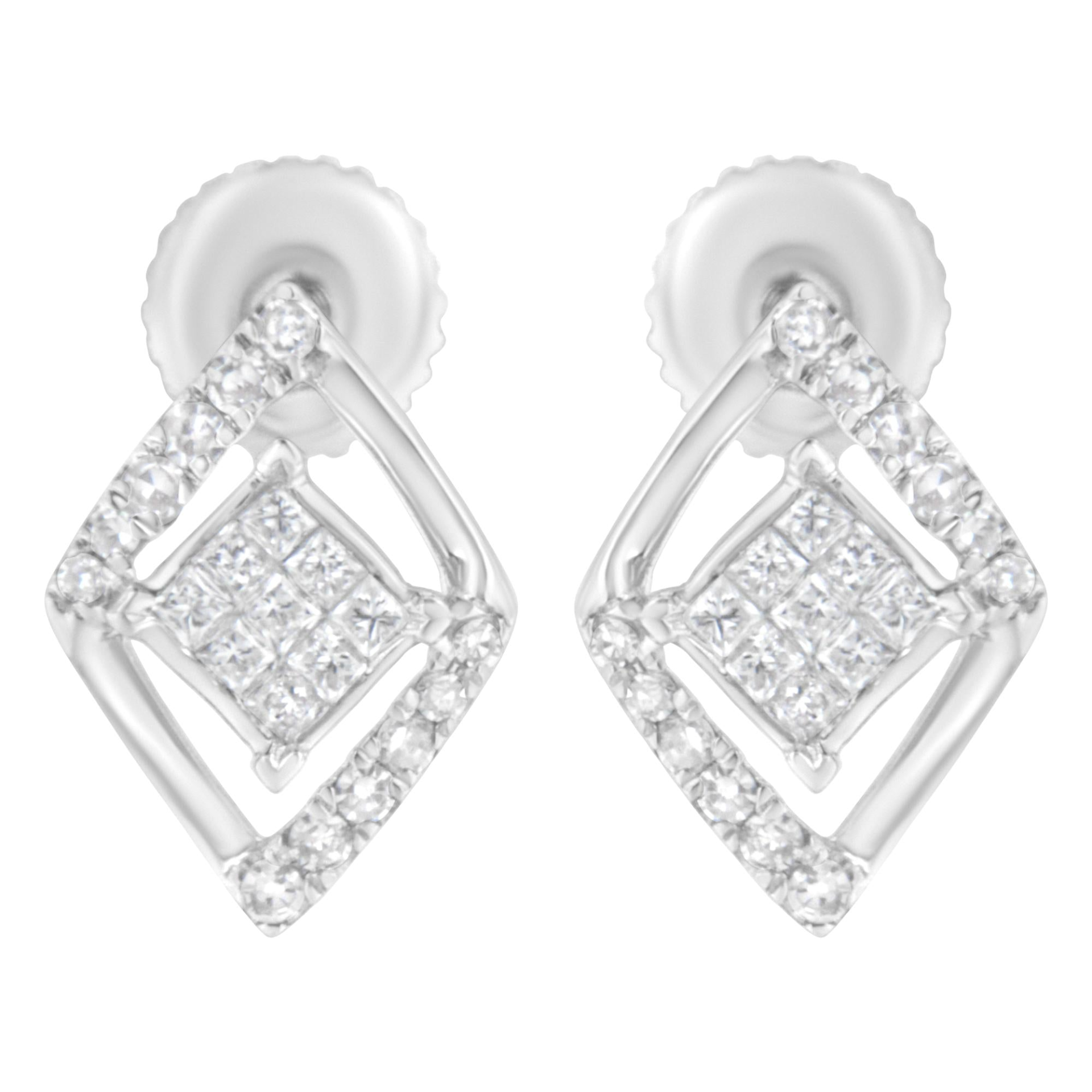 Elegant and timeless, these gorgeous 10 karat white gold stud earrings feature 0.327 carat total weight of diamonds with 42 individual stones. These earrings have a kite set square shape floating inside a diamond shaped frame. The square is made up of an invisible set cluster of 9 square, princess cut diamonds. This composite diamond floats inside a domed diamond shaped frame studded on opposing diagonal sides with round diamonds. The earrings feature secure threaded screwback closures. These classic earrings make a great gift for any special occasion! Diamonds are thought to give the wearer clarity and illuminate solutions to life’s problems, as well as encouraging abundance, strength, courage, harmony, faithfulness, and commitment. These stud style earrings are subtle enough for casual affairs but sparkle in formal settings as well. Coordinate these earrings with your favorite diamond necklace or other diamond jewelry to create a complete elegant ensemble.