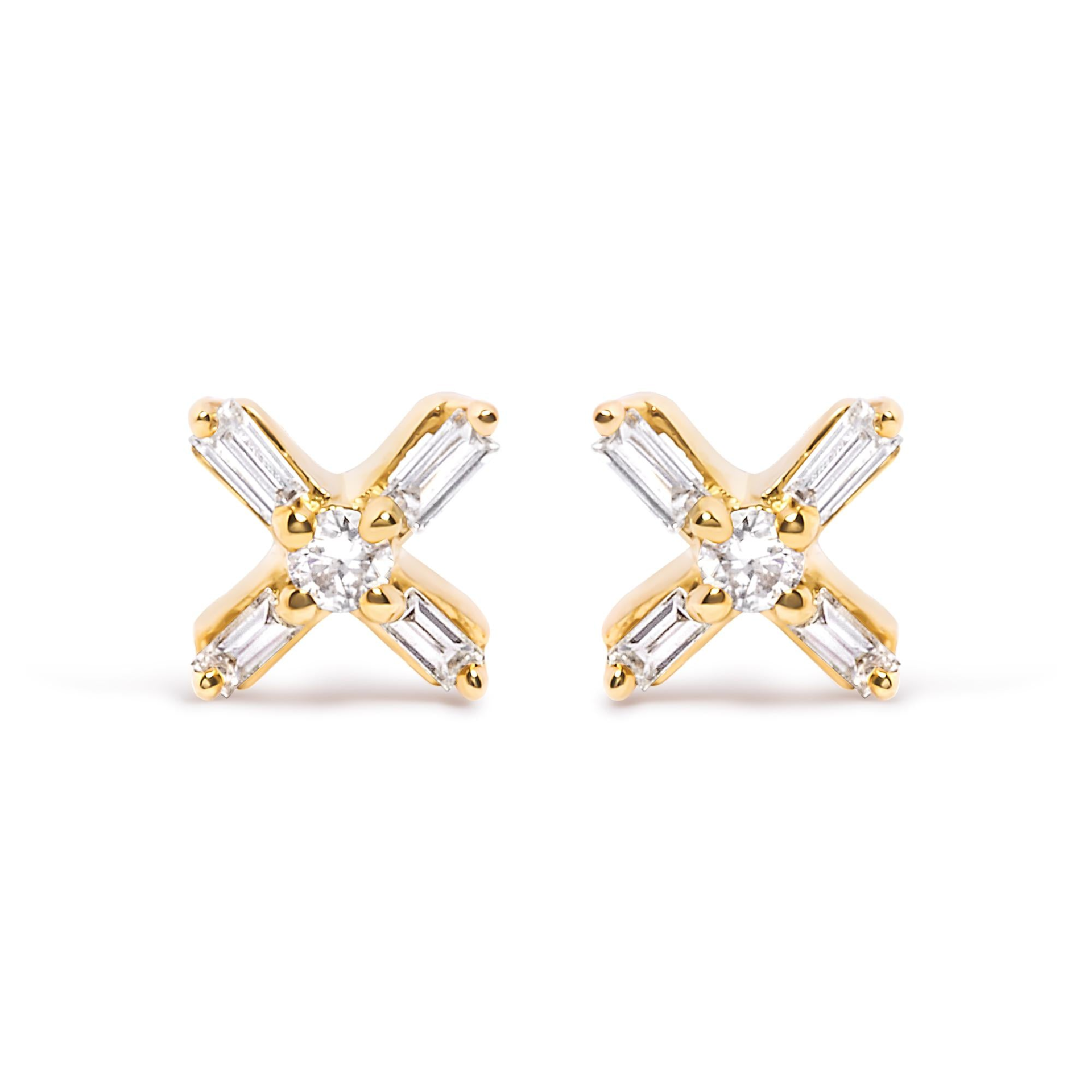 10K Yellow Gold 1/10 Cttw Round and Baguette Diamond Criss Cross X Stud Earring (H-I Color, I1-I2 Clarity)