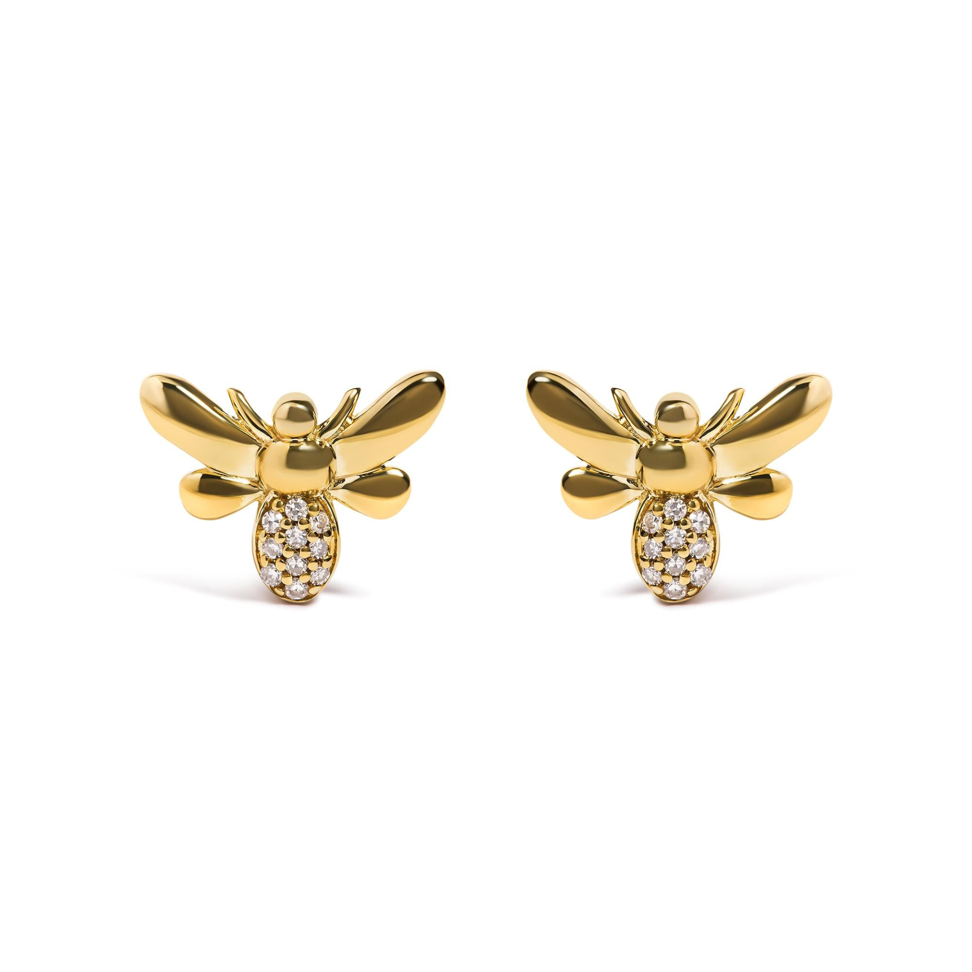 Introducing a dazzling masterpiece that will make your heart flutter with delight! Crafted in lustrous 10K yellow gold, these exquisite bumble bee stud earrings are a true treasure to behold. Adorned with a mesmerizing array of 20 round diamonds accented, their brilliance is simply unmatched. The natural diamonds, with their H-I color and I1-I2 clarity, are meticulously set in a pave setting, ensuring a seamless and glamorous look. With their push back earring findings, these captivating earrings offer both comfort and security. Designed exclusively for women who appreciate the finer things in life, these enchanting bumble bee earrings will effortlessly elevate your style and exude a timeless elegance. So why wait? Embrace the allure of nature and indulge in the beauty of these diamond-accented earrings.