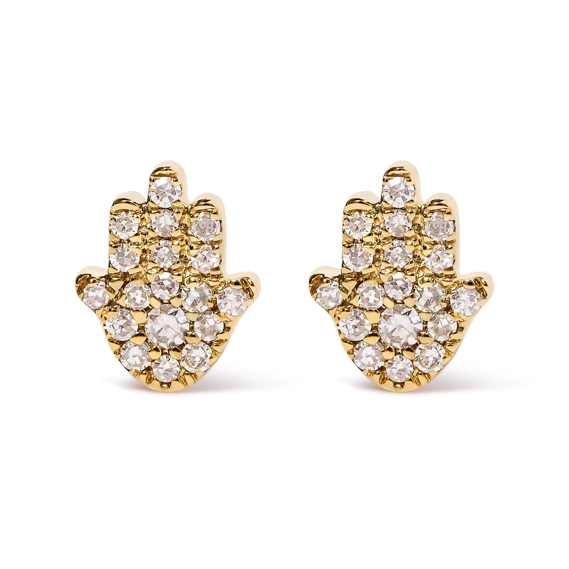 Introducing a captivating symbol of protection and beauty, these 10K Yellow Gold Diamond Accented Hamsa Stud Earrings are an absolute must-have for any woman seeking elegance and grace. Crafted with meticulous attention to detail, each earring features a round-cut diamond, expertly set in a pave setting, forming a stunning hamsa design. With a count of 36 dazzling diamonds, these earrings effortlessly exude a radiant sparkle. The natural diamonds boast an H-I color, adding a touch of warmth and brilliance to your ensemble. Rest assured, the I1-I2 clarity ensures a mesmerizing display of light. Completed with secure push-back findings, these earrings are suitable for everyday wear, making them a perfect addition to your jewelry collection. Indulge in the allure of these Hamsa Round Diamond Earrings and embrace the enchantment they bring.