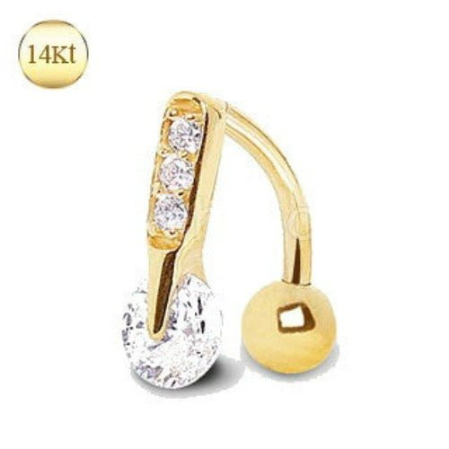 Indulge in pure luxury with this exquisite 14kt yellow gold top down navel ring! Featuring one large round CZ gem and three smaller round gems, this is the fanciest gold belly ring you'll find. Crafted from genuine solid 14 karat yellow gold, this piece is an investment in timeless elegance and quality that will last a lifetime.