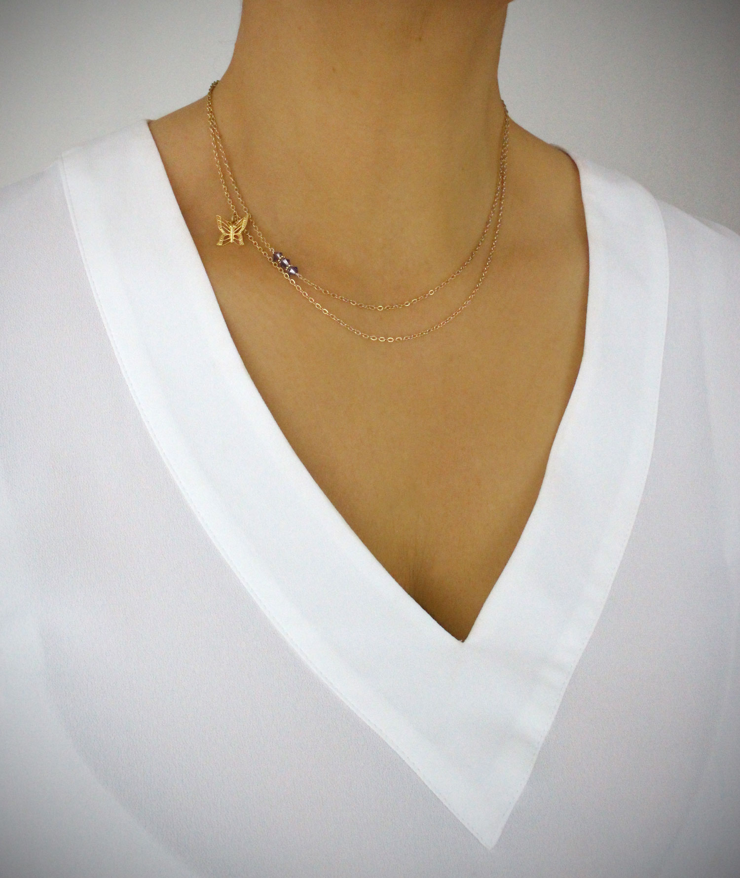 18K gold plated double chain butterfly necklace with Tanzanite crystals