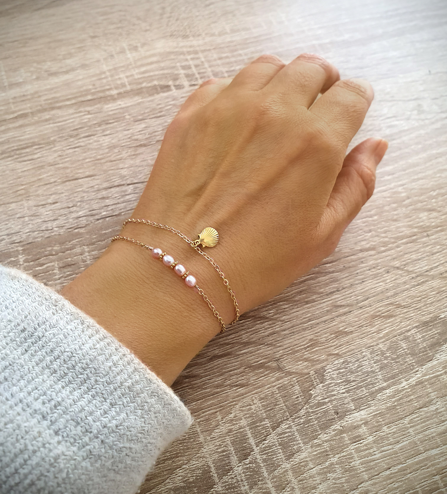 The look and feel of a day at the beach can be yours all year long when you wear ocean life jewelry. Decorated with rose freshwater pearls and a delicate seashell, this mesmerizing 18K gold plated double chain bracelet combines classic elegance with ocean imagery. A perfect gift for ocean lovers.