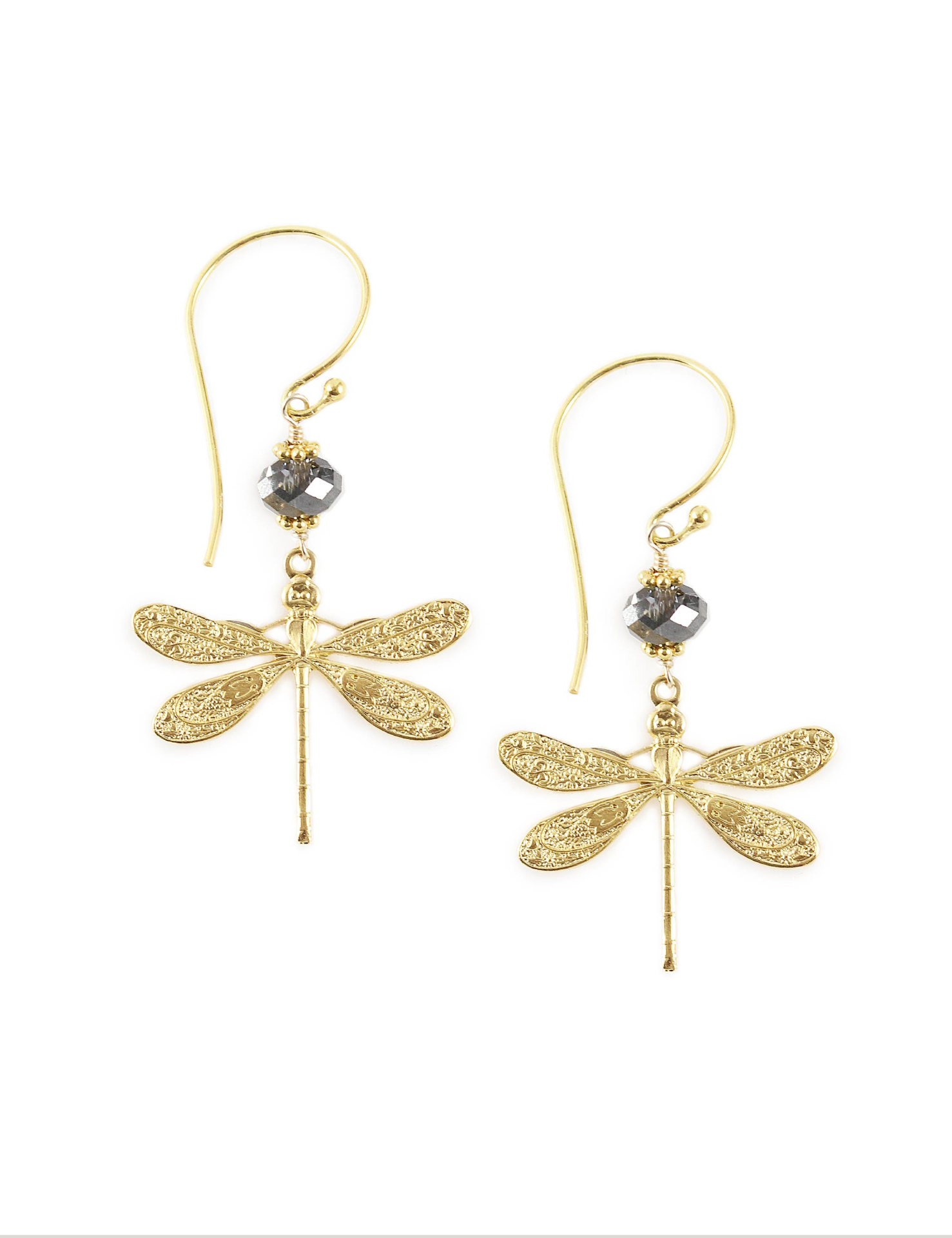 18K gold plated dragonfly earrings with Black Diamond crystals