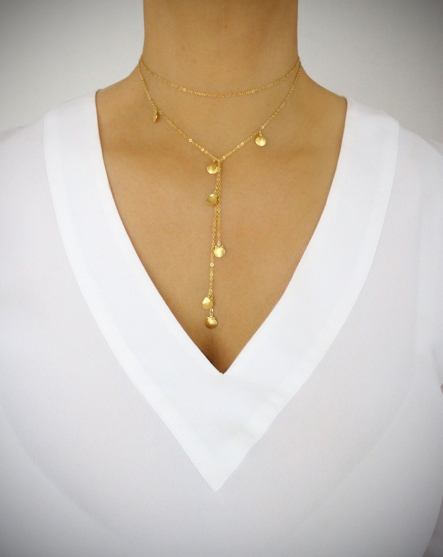Inspired by the beauty of the ocean, this elegant long seashell necklace will add style to any daytime or evening outfit. Handmade with 18K gold plating and adorned with delicate seashells, the wrap necklace provides a refined look and offers endless opportunities to create your own style. It can be worn numerous ways: wrap it, double it or tie it to make it your own. However you decide to dress up this seashell necklace, you are guaranteed to get compliments.
