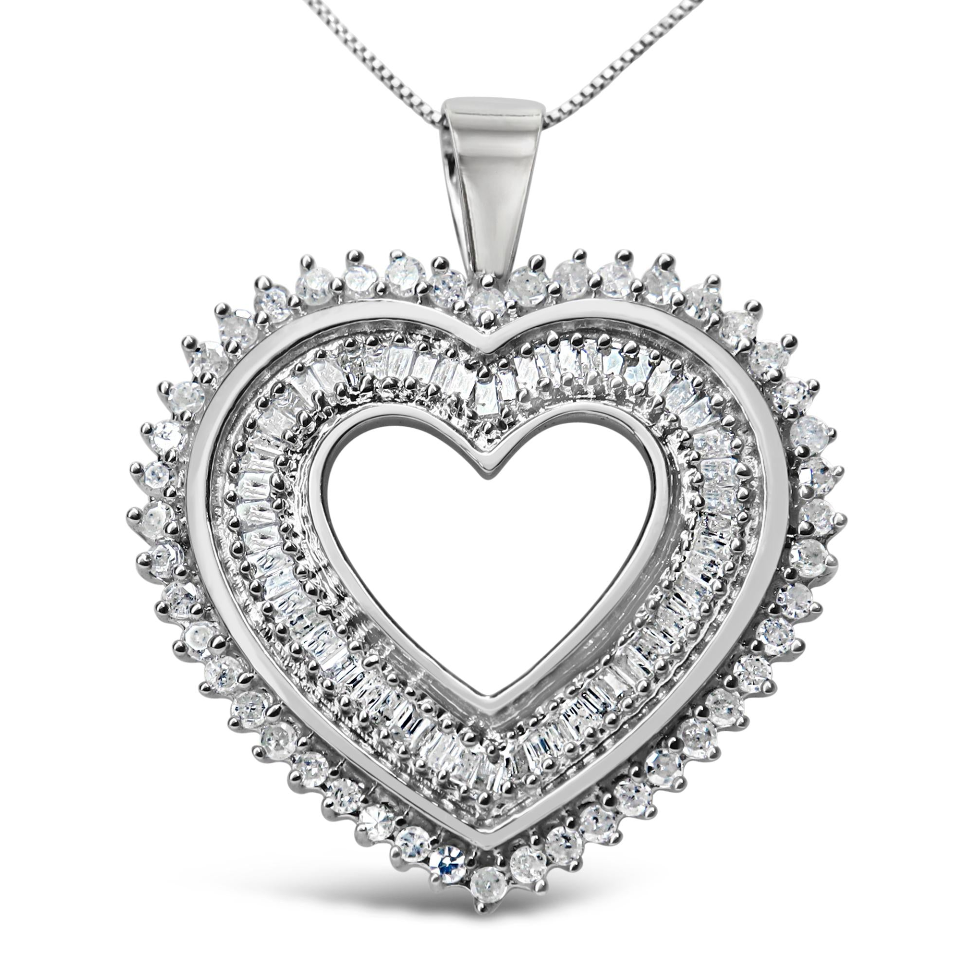 .925 Sterling Silver 1.0 Cttw Baguette and Round Diamond Heart Pendant 18" Necklace (H-I Color, I3 Clarity)