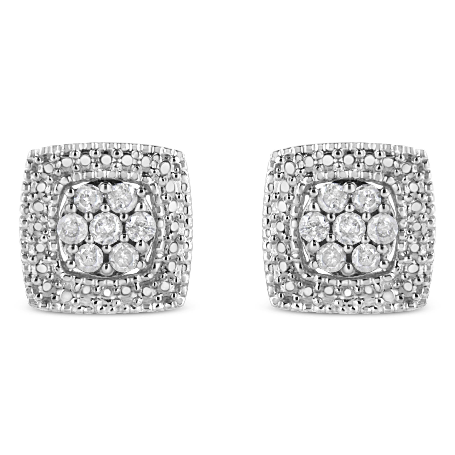 Treat yourself to these elaborate .925 sterling silver miligrain studs. The outer layer of these square earrings are set with silver beads that outline a center design set with 7 sparkling, round-cut diamonds. These gorgeous studs have a total diamond weight of 1/2 cttw and will dress up any outfit in your closet.