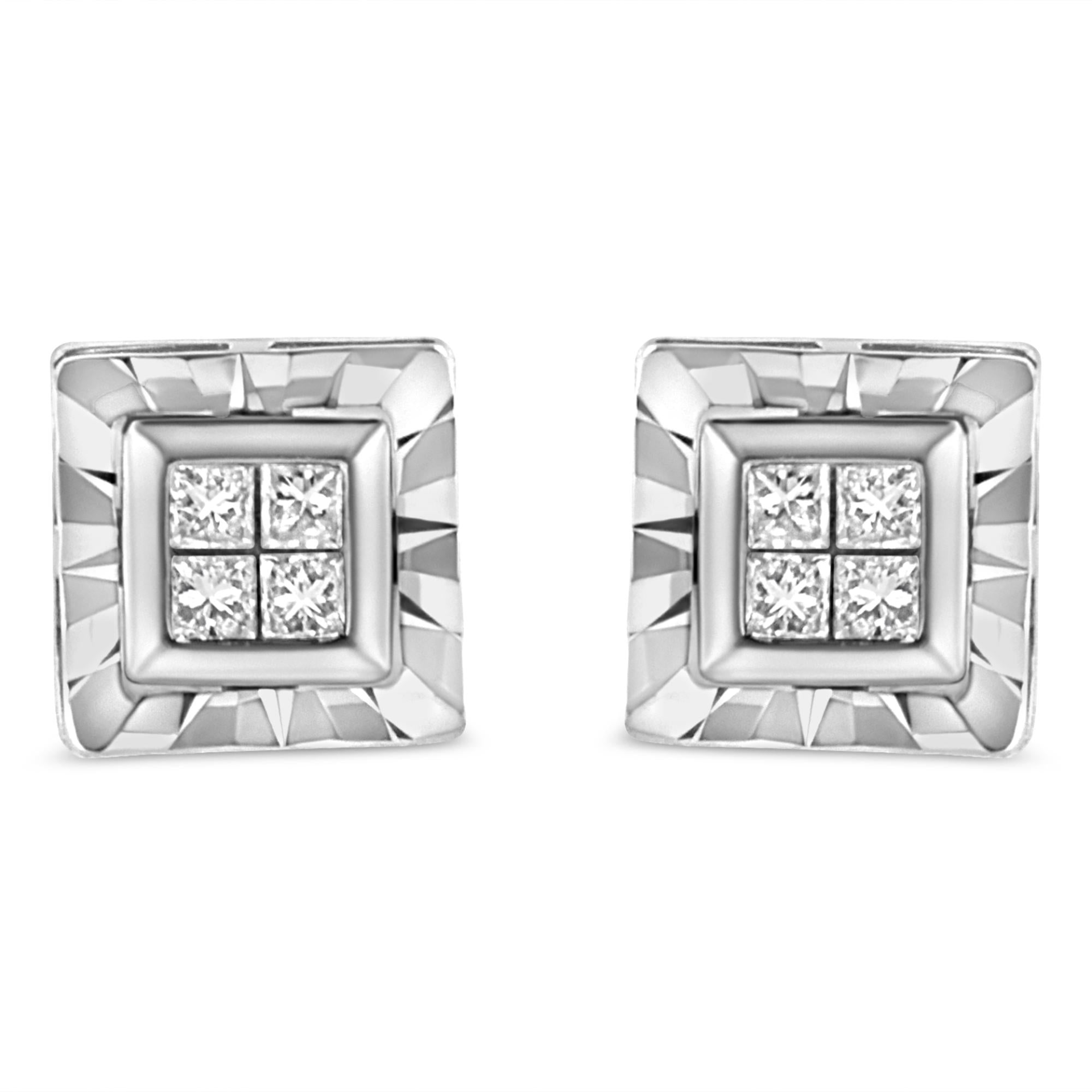 You will love these elaborately designed stud earrings set in cool .925 sterling silver. The outer square of these composite studs display a textured silver look, followed by a band of silver outlining four princess-cut diamonds at the center. These diamonds are invisible set and have a total carat weight of 1/6 cttw. Wear these earrings to any event and be dazzled by compliments.