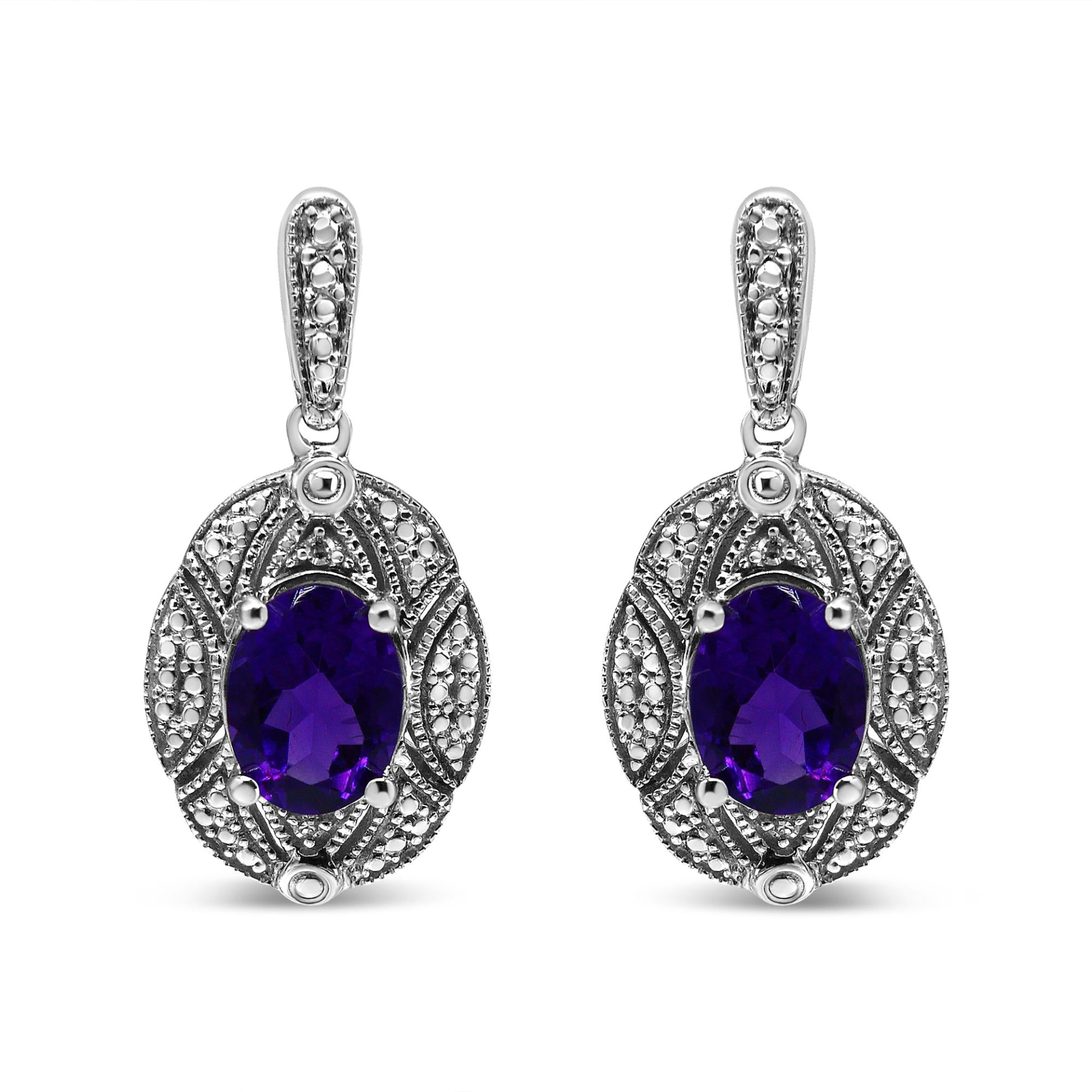 These elegant diamond accent and gemstone stud earrings boast a glorious sense of style! Set in .925 sterling silver, a 8*6mm oval-cut amethyst gemstone in purple glows against a halo of intricate milgrain detailing and round-cut white accent diamonds. The prong set accent diamonds add a touch of beauty in an approximate I-J color and I1-I2 clarity. Wear securely with push back findings and add dazzle of color to your wardrobe. Wear these earrings in honor of your February birth month for a personalized piece with an amethyst birthstone that symbolizes intuition, clarity, and peace of mind.