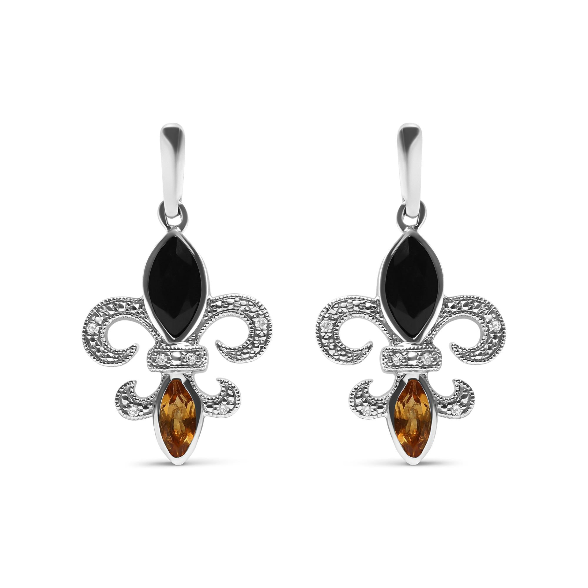 .925 Sterling Silver Marquise Cut Onyx and Citrine with Diamond Accent Fleur De Lis Drop Stud Earrings (H-I Color, SI1-SI2 Clarity)