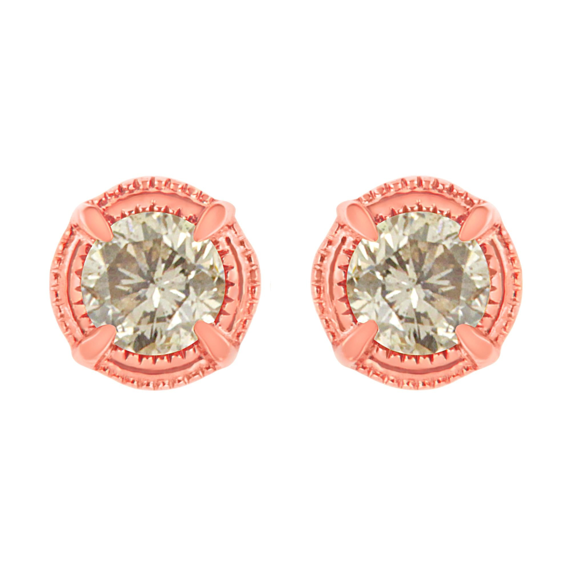 Elegant and timeless, these gorgeous tarnish resistant 14 Karat yellow gold plated 92.5% sterling silver stud earrings feature a pair of round, brilliant cut diamonds with 1 carat total diamond weight. These sparkling solitaire style diamonds are placed in the center of a raised double ring of milgrain detailing which is reminiscent of the look of beads strung together. The earrings have a high shine, polished finish and feature ultra secure threaded posts with screw backs for comfortable and secure wear all day long. These beautiful earrings make a great gift for any special occasion. Whether worn for daytime glamour or evening sparkle, these earrings are gorgeously versatile. Coordinate them with your favorite diamond necklace or other diamond jewelry to create a complete and elegant ensemble. They are a classic and feminine set she'll want to show off every day.