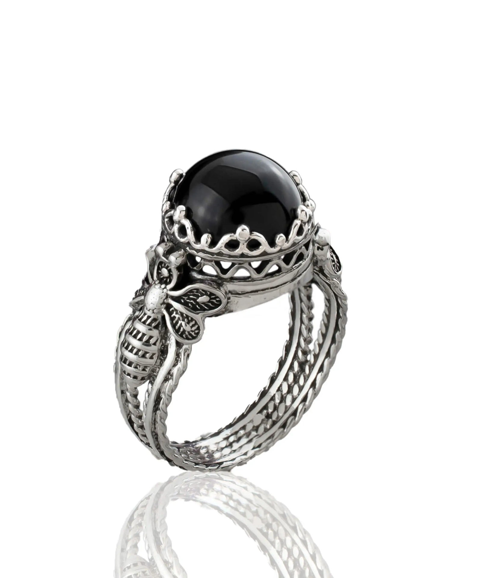 Bee Detailed Black Onyx Gemstone Filigree Art Women Silver Cocktail Ring