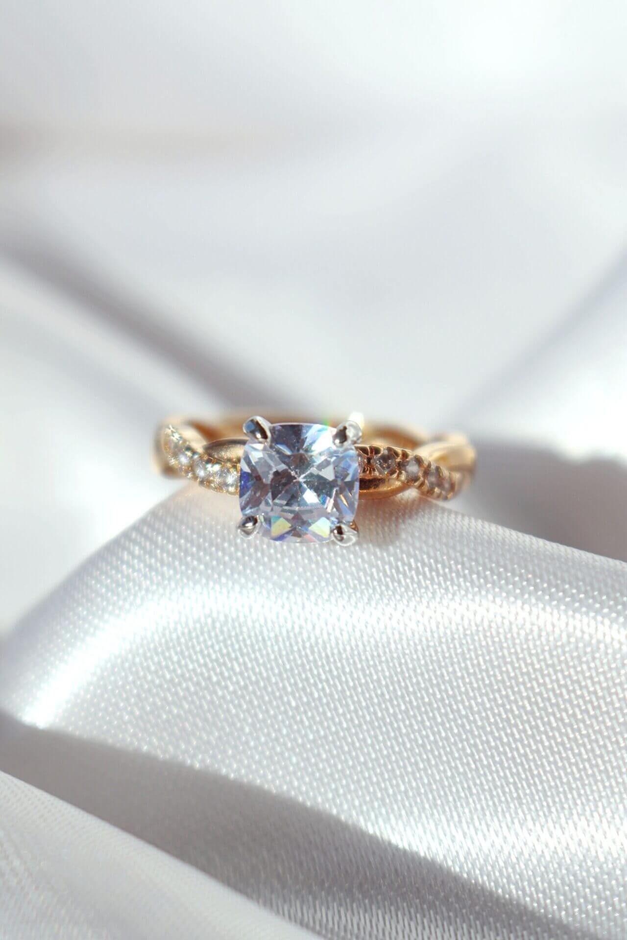 This romantic solitaire ring is made of 18 karat rose gold plated copper and diamond cut cubic zirconia inlays.