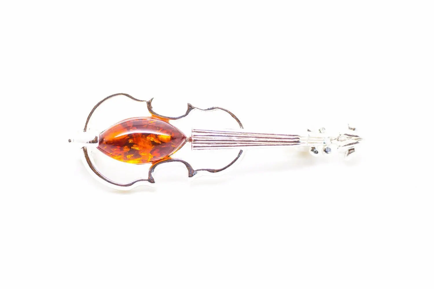 A beautiful violin pin brooch, handmade from high quality sterling silver and accentuated with a small baltic amber stone.