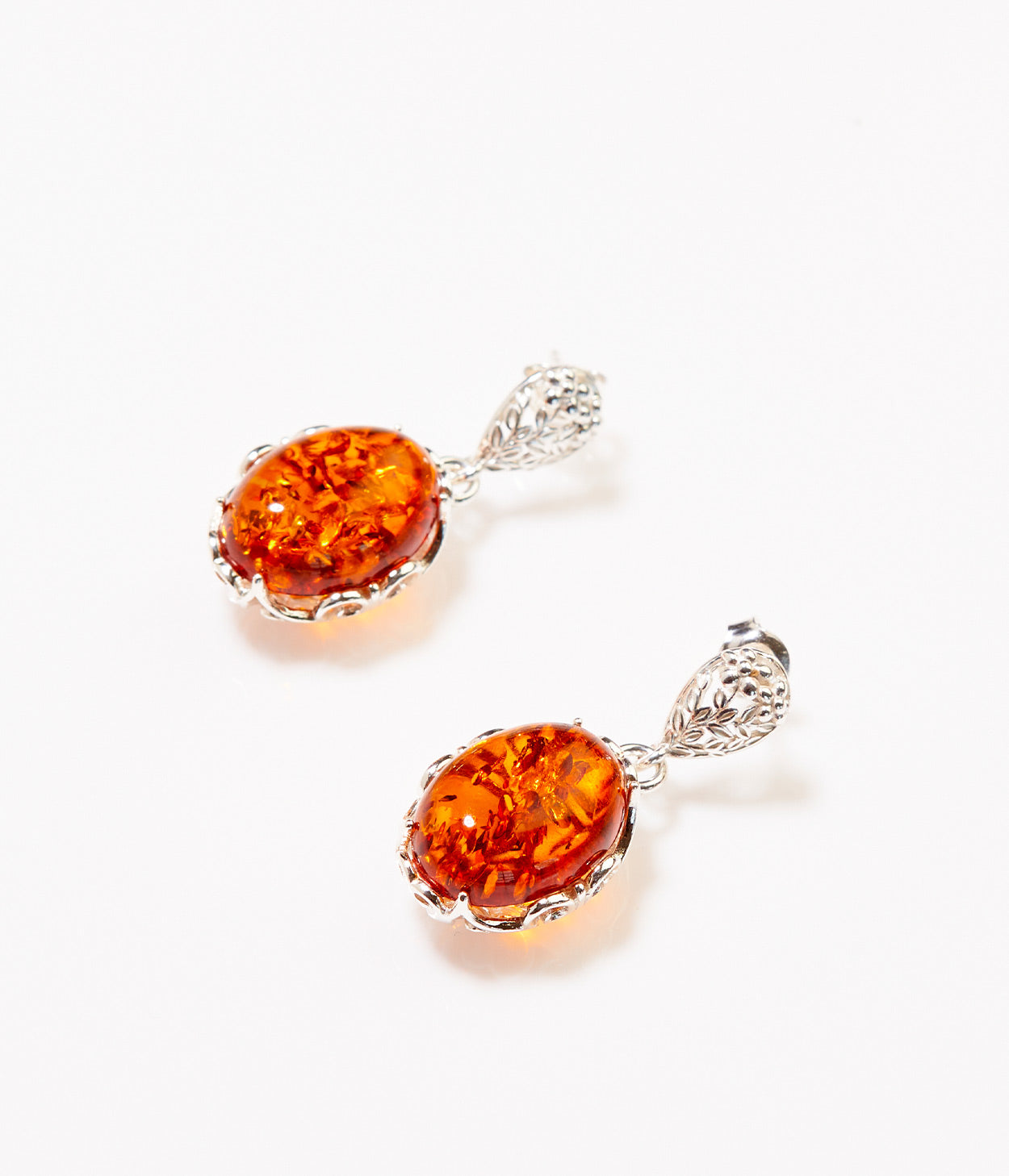 These Oval Amber Drop earrings feature a decorative frame and void openwork back for an incredible tone of radiant and fiery Orange Amber.
