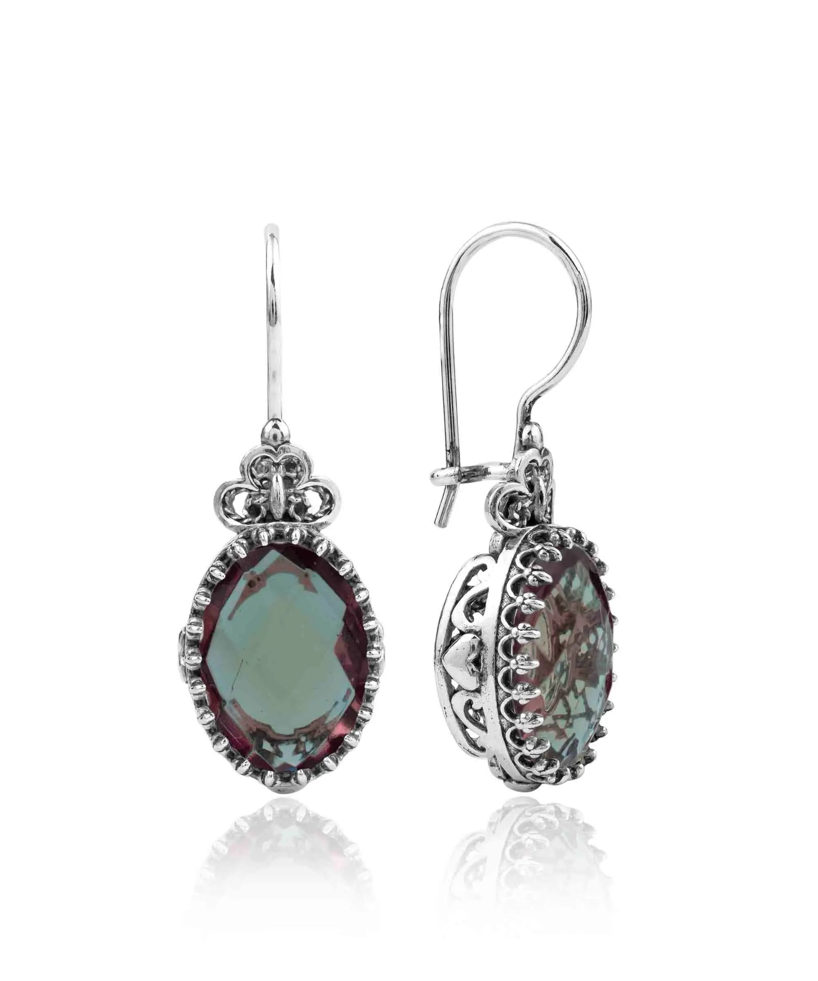 Filigree Art Alexandrite Gemstone Heart Detailed Women Silver Oval Drop Earrings