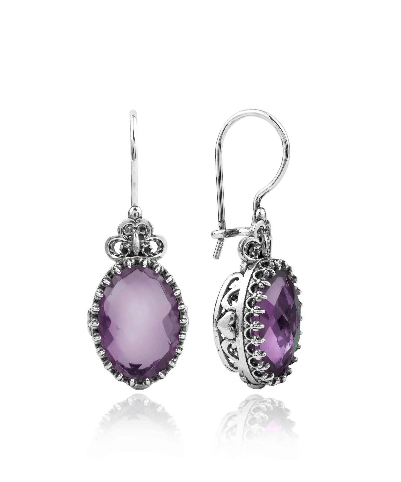 Make a statement with these magnificent 925 sterling silver filigree art heart detailed women's oval drop earrings, which include amethyst gemstones, the birthstone for February. The double-sided faceted 10x14mm oval cut amethyst is sure to attract the eye and give a touch of elegance to any outfit.