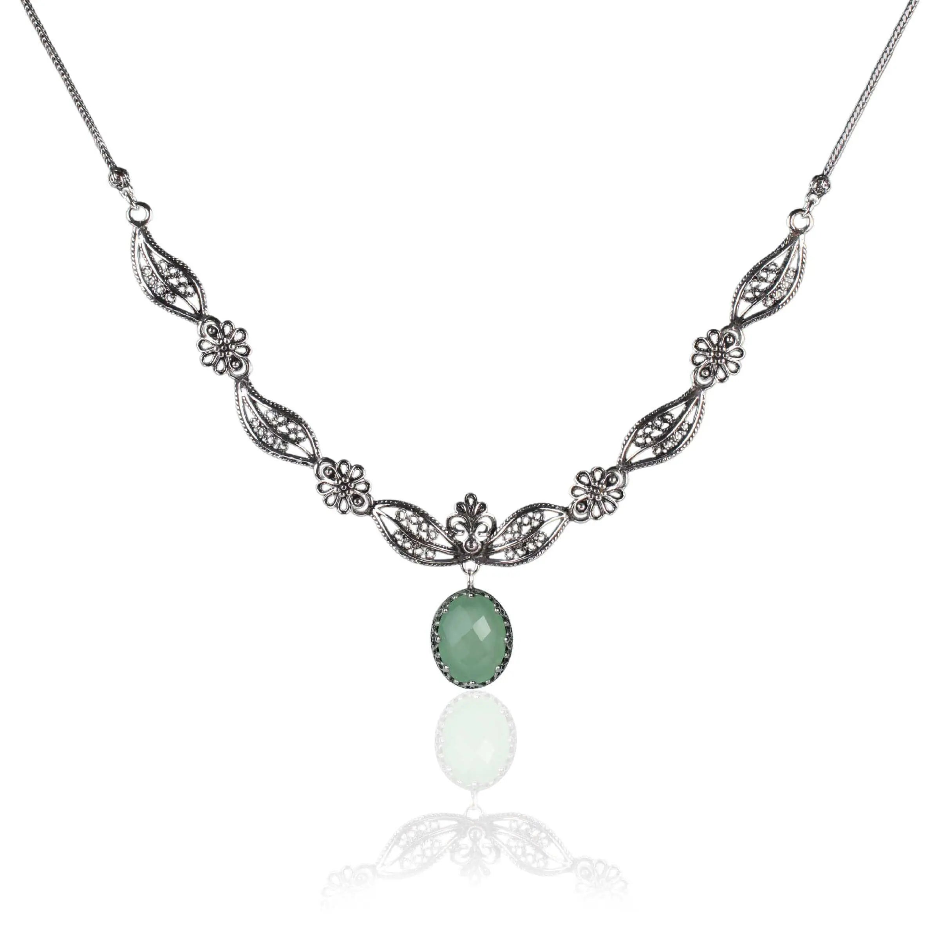 Filigree Art Aqua Chalcedony Gemstone Women Silver Princess Necklace