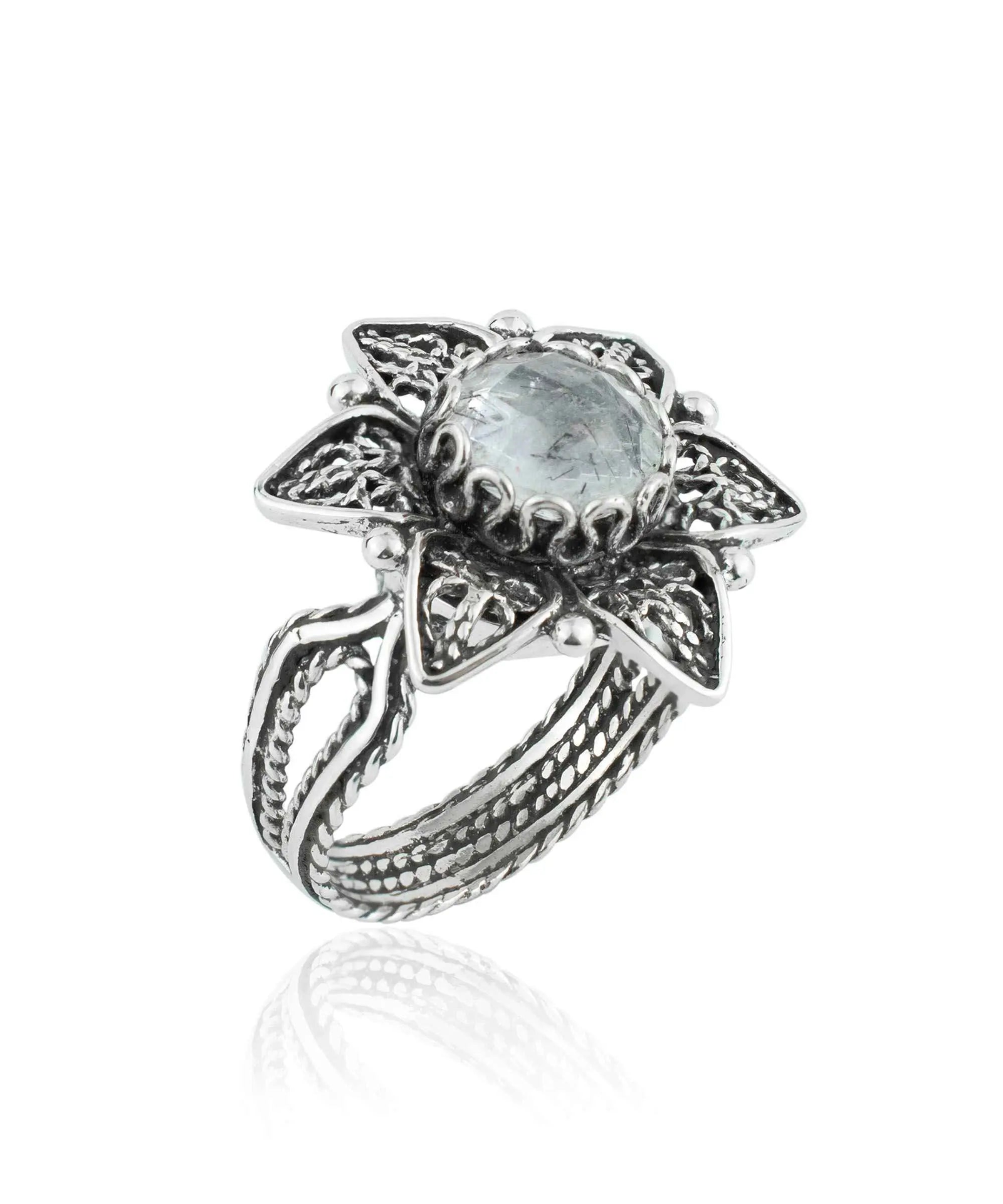 Filigree Art Black Rutile Gemstone Daisy Flower Women Silver Cocktail Ring