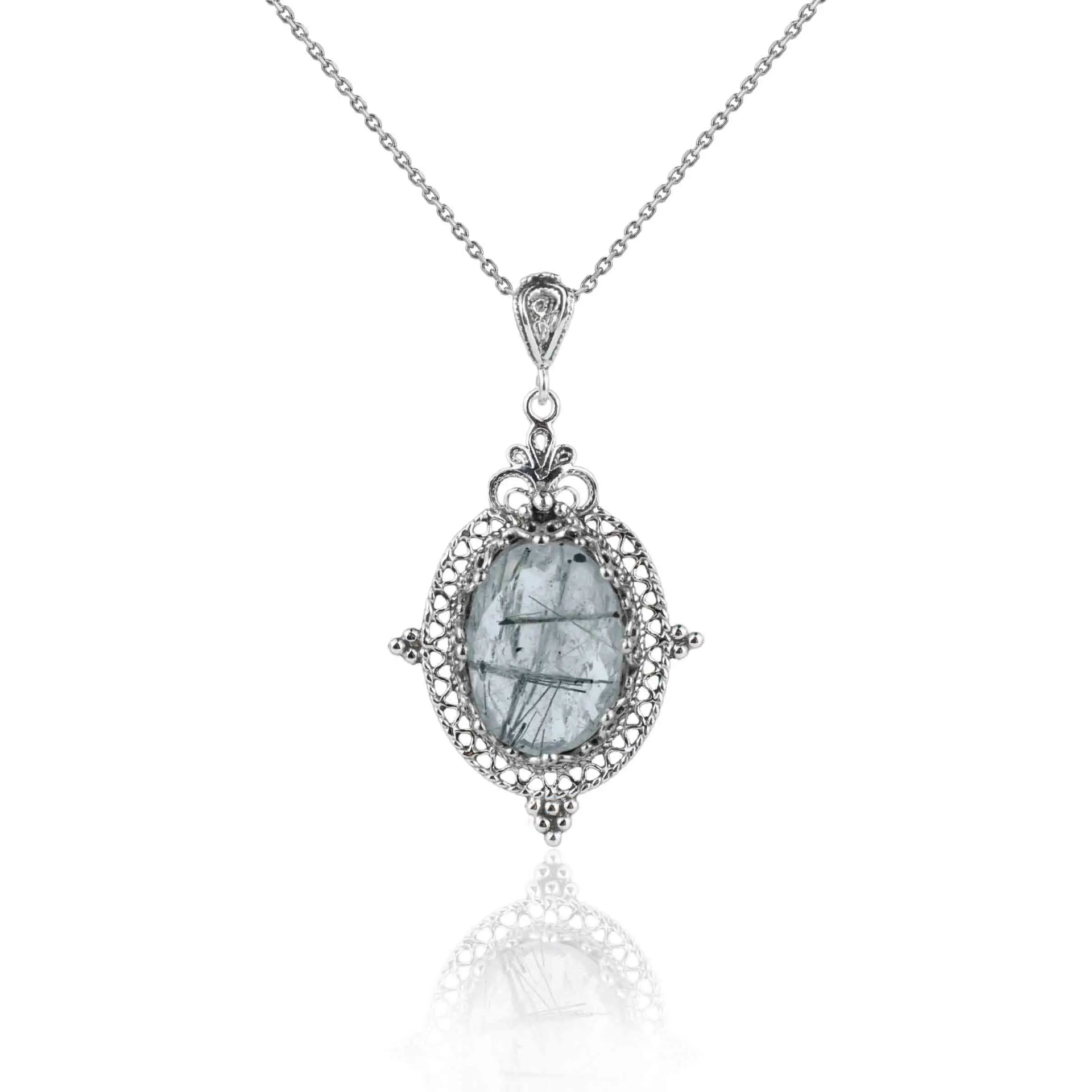 Filigree Art Black Rutile Gemstone Women Silver Oval Pendant Necklace