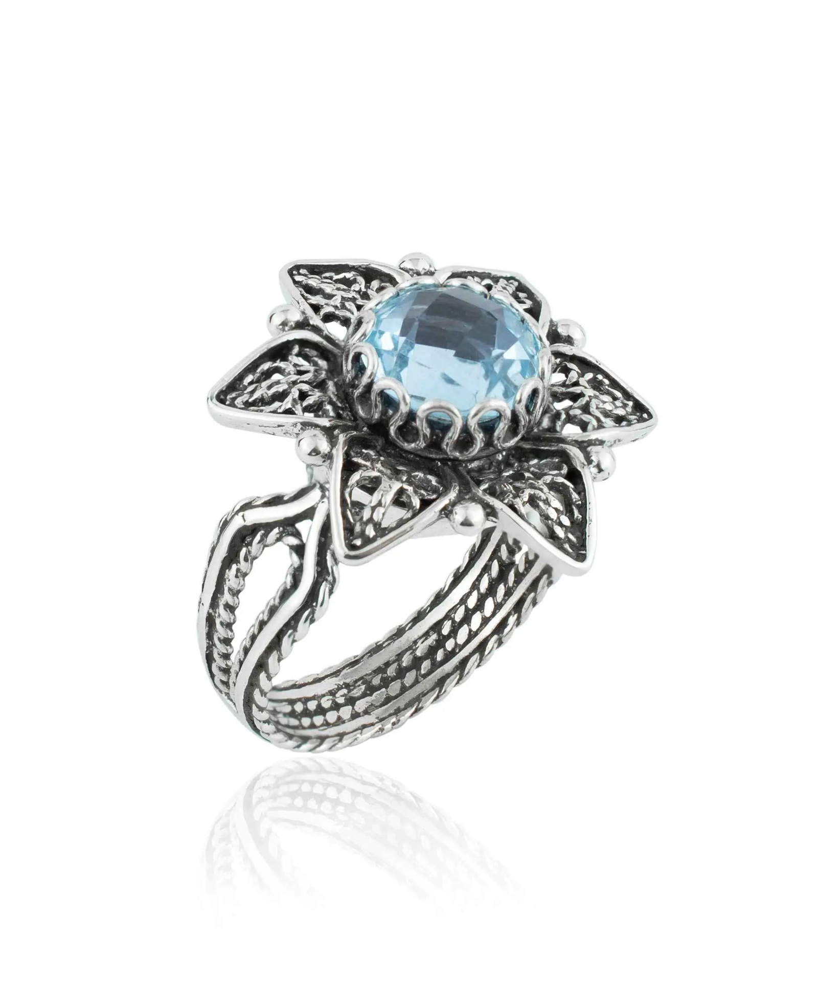 Filigree Art Blue Topaz Gemstone Daisy Flower Women Silver Cocktail Ring