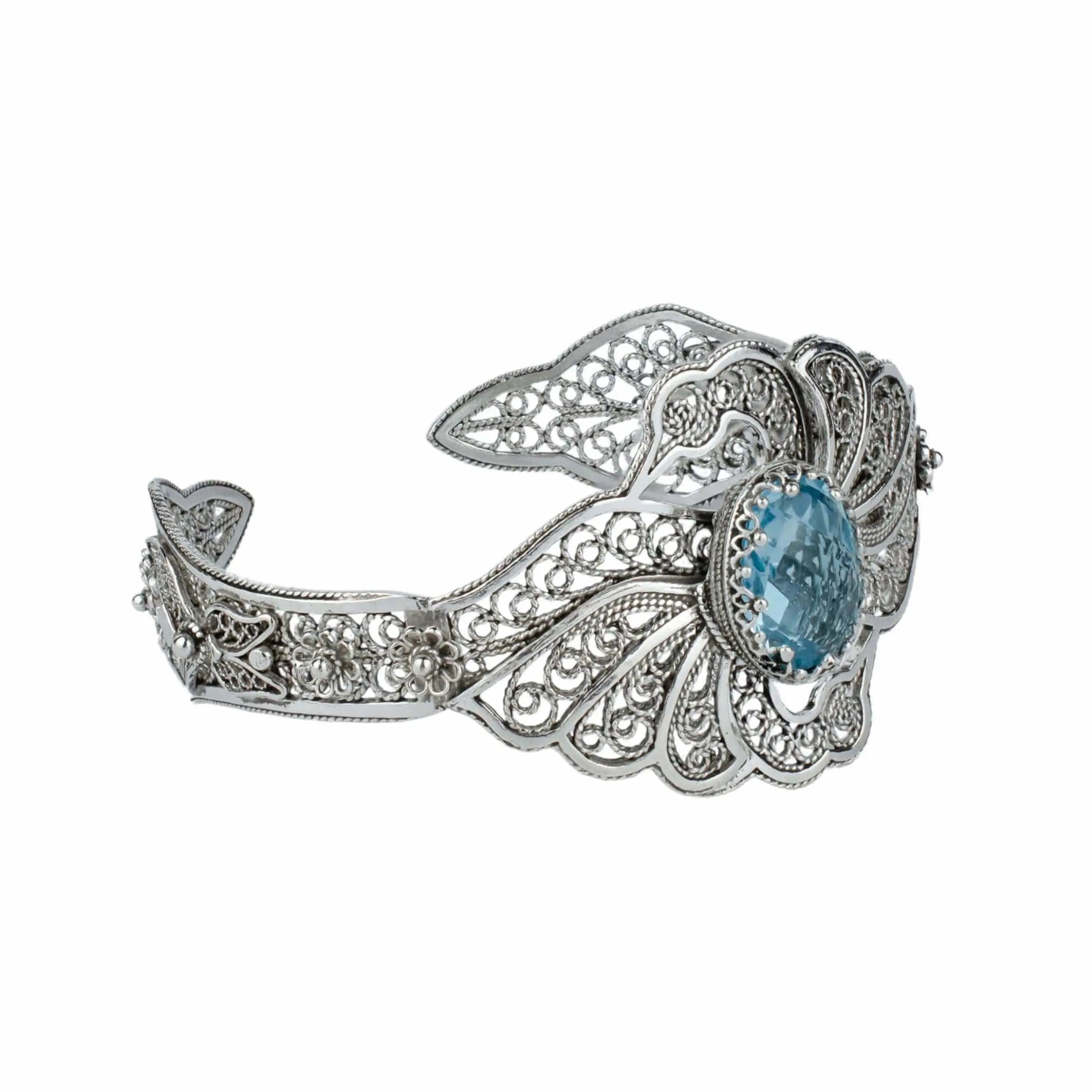 Filigree Art Blue Topaz Gemstone Double Swan Figured Women Silver Cuff Bracelet
