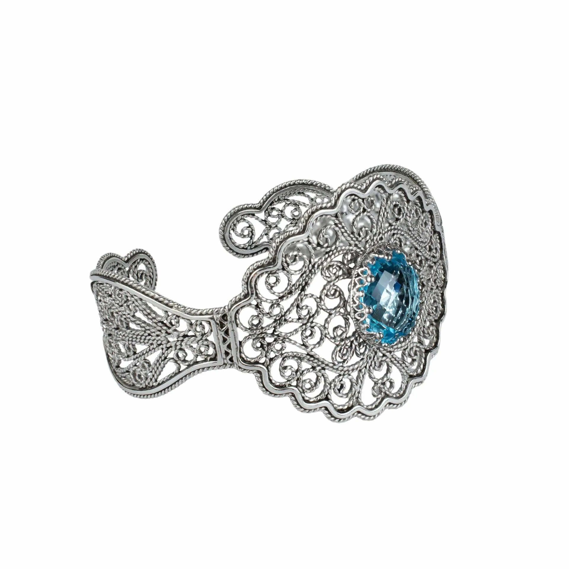Filigree Art Blue Topaz Gemstone Lace Detailed Women Silver Cuff Bracelet