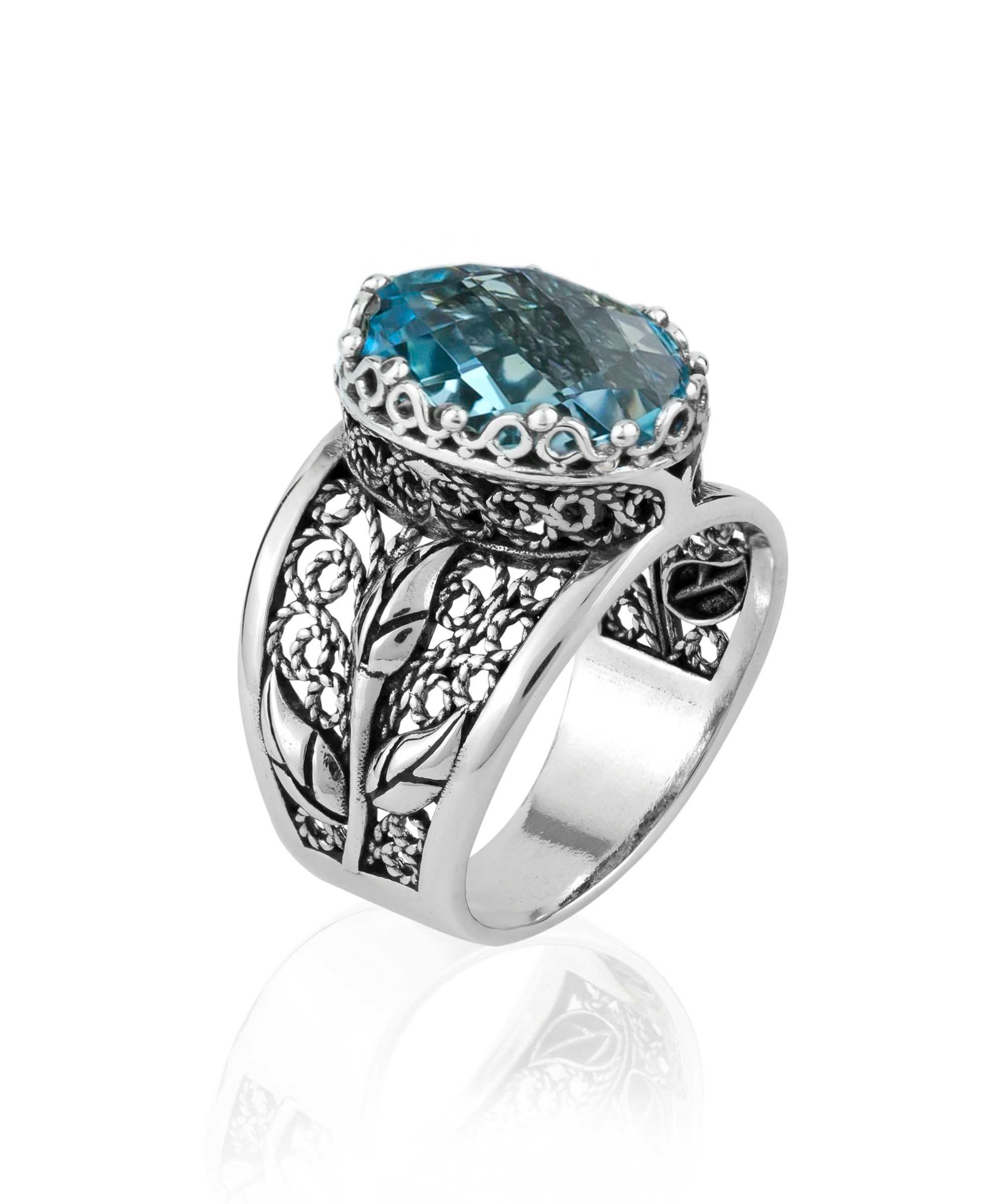 Filigree Art Blue Topaz Gemstone Tulip Detailed Silver Women Statement Ring